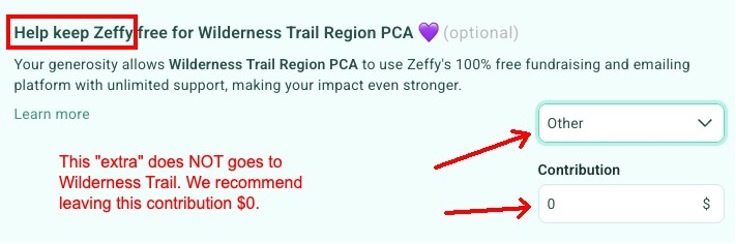 PS.: During the check-out, there will be a field asking for extra money to the payment platform Zeffy. It may say something like: Help keep Zeffy free for Wilderness Trail Region PCA 💜 (optional) Your generosity allows Wilderness Trail Region PCA to use Zeffy's 100% free fundraising and emailing platform with unlimited support, making your impact even stronger. We recommend changing the suggested amount to 'Other' and type $0 as this contribution does not goes to Wilderness Trail. See example below: