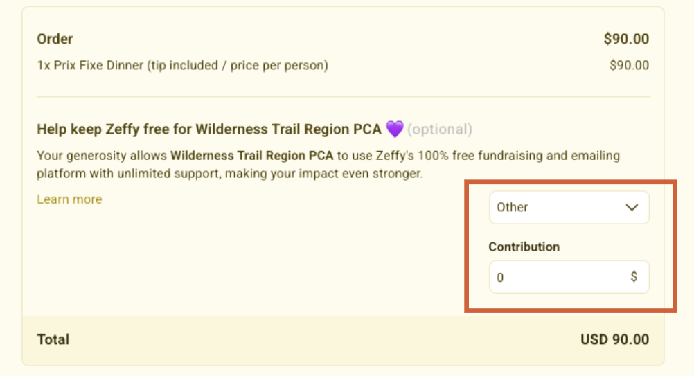 During the check out, feel free to change the amount to $0 at the field below (This is a contribution to the Zeffy payment platform, not to Wilderness Trail).